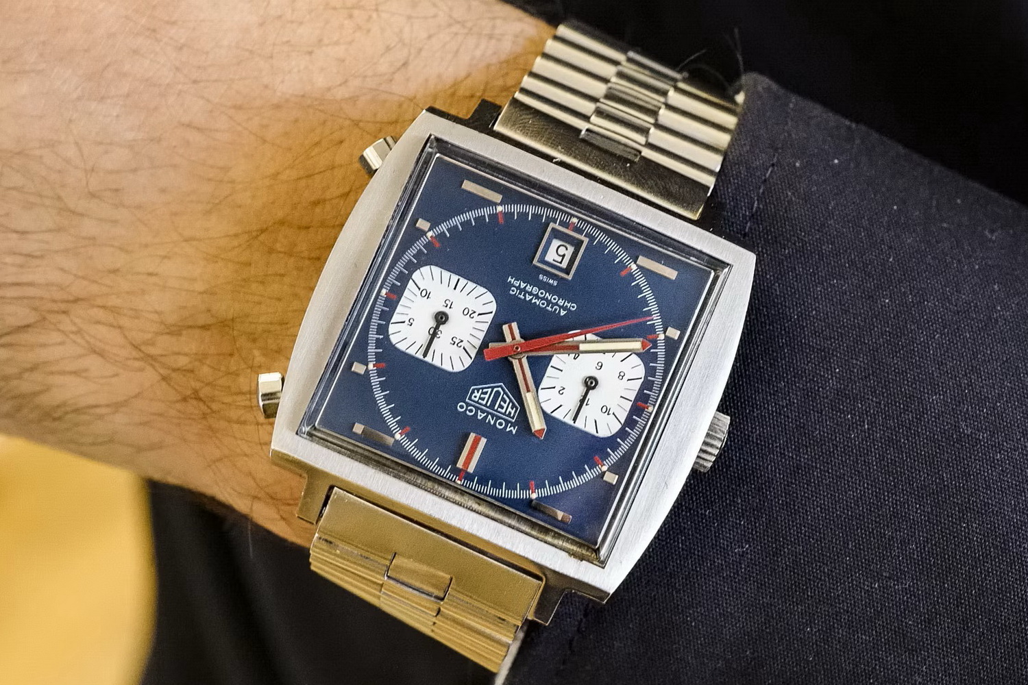 11. Monaco, reference 1133, with blue, black and red test dial – Morgan King had the craziest looking watch on the table, and 50 years later we can only wonder why Heuer never pushed the button to put it into production. If you have to have one, Bamford Watch Department can give you one with a similar look.