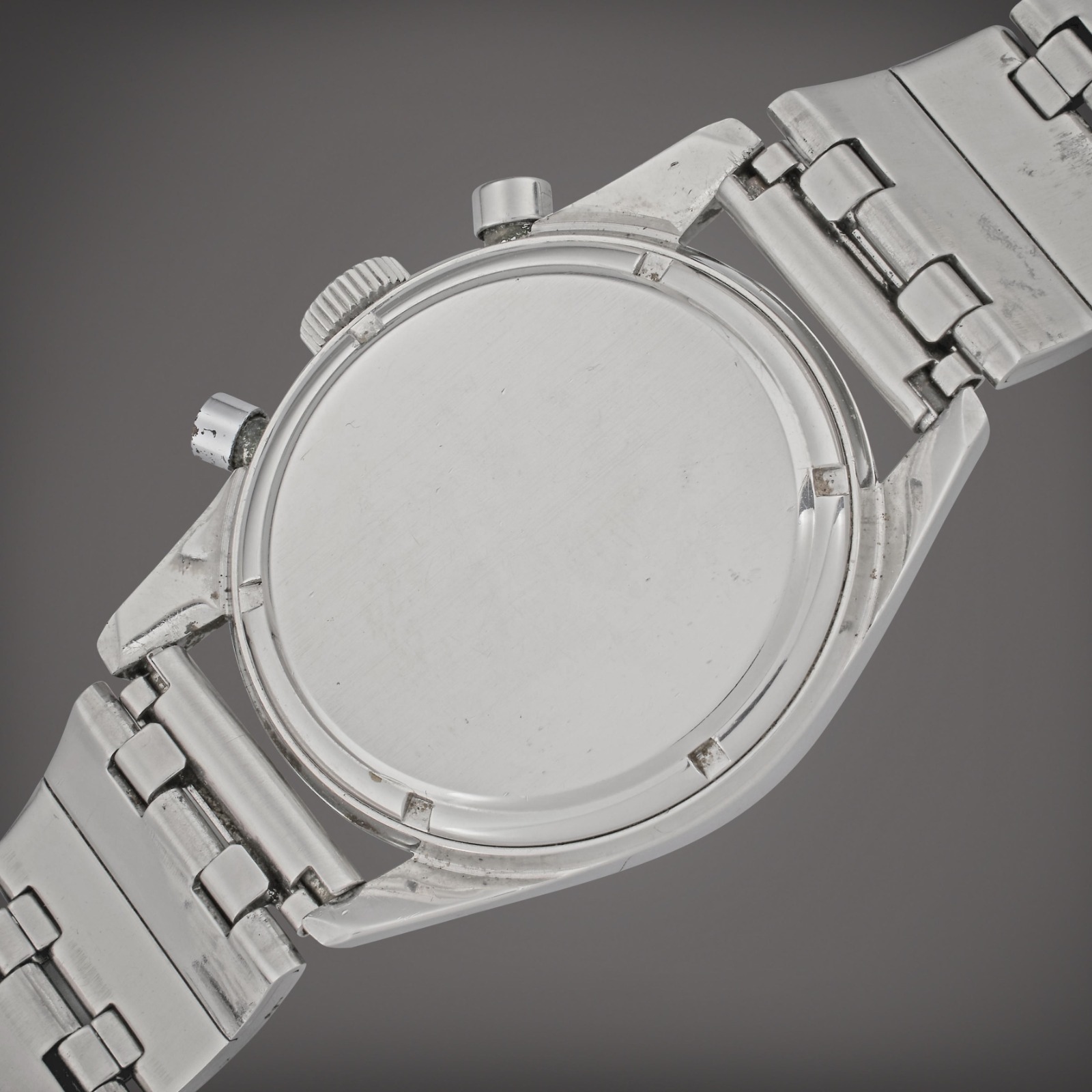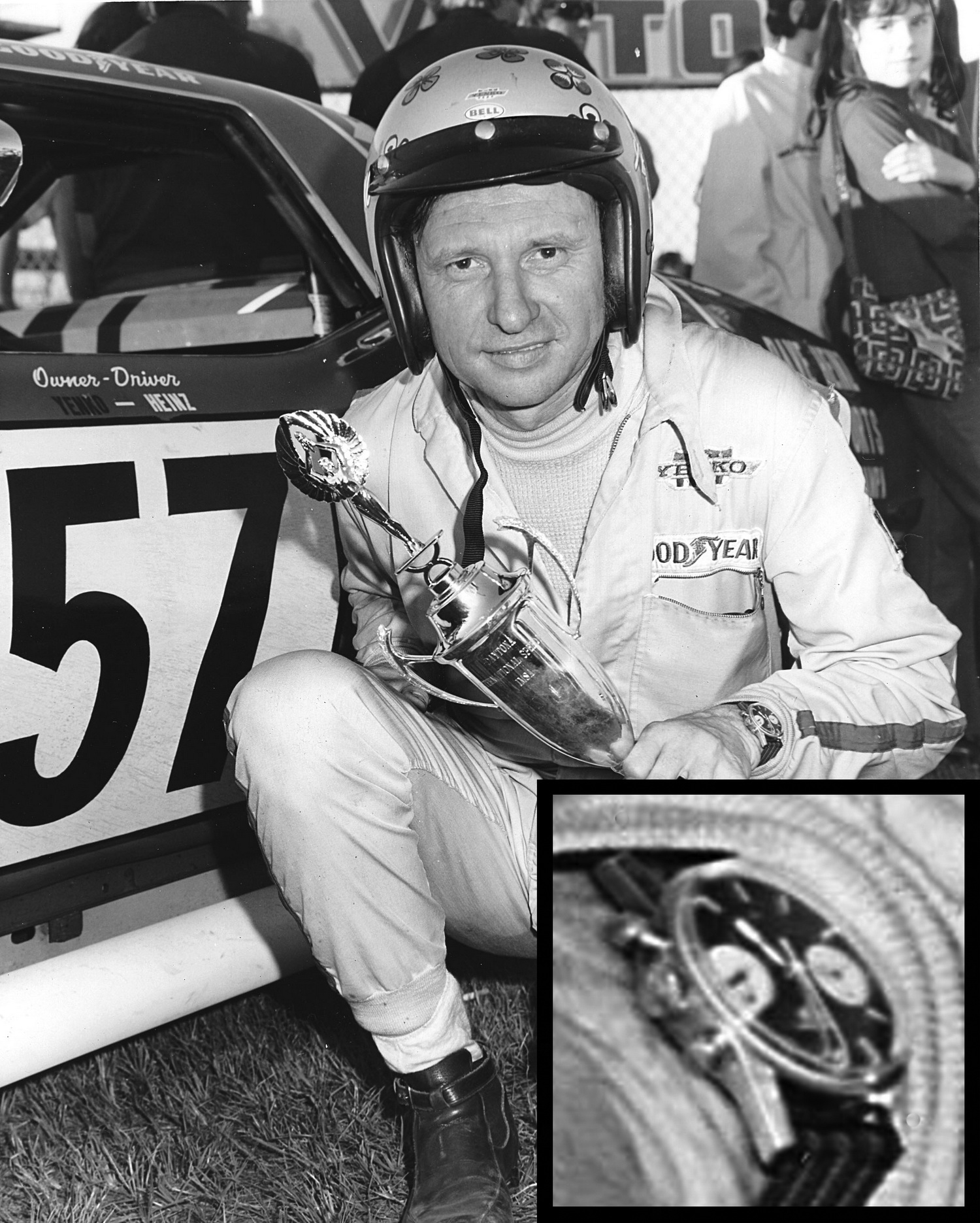In this photograph from 1971, Don Yenko is wearing a Carrera 30, Reference 7753 NS.  This is the “reverse Panda” model, with a black dial and white registers.
