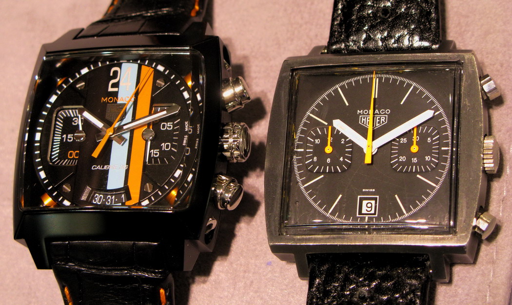 One of your favorite chronographs is the black PVD-coated Monaco (Reference 74033 N), as shown below right. You are wearing this old Monaco one day, when you walk into a local watch store, and see the new TAG Heuer Monaco 24, as shown below left.