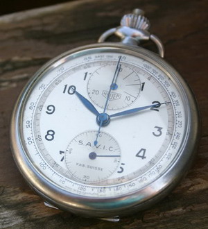 Mr. Heuer’s description of SAVIC and its success in selling Heuer stopwatches and timers into the French market suggested another channel for research relating to the Fab. Suisse mark. Over the years, we have seen numerous stopwatches, pocket chronographs and dashboard timers that are co-branded “Heuer” and “S.A.V.I.C. I dug through my photo files and found a few photos of timepieces with the SAVIC name on the dial. Just as we might have expected, all these timepieces also had the Fab. Suisse marking on the dial.