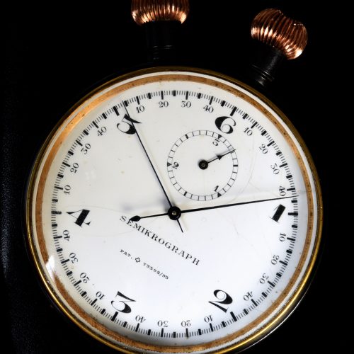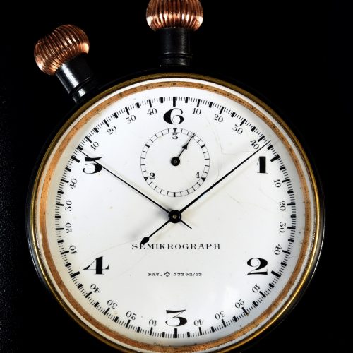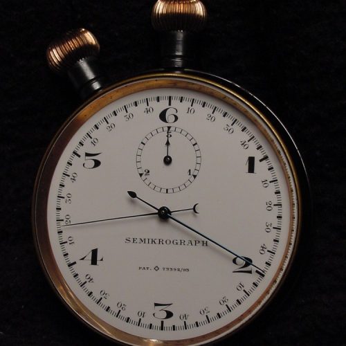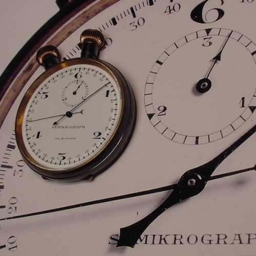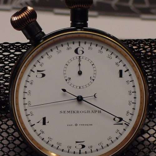 The Semikrograph offers 1/50 second accuracy, with a capacity of 3 minutes and a split second function. Center crown is for start / stop / reset; pusher on left stops the split hand and then returns the split hand to join the main hand. As described below under “Catalog Information”, later versions with these same features were called “Semicrosplit”.