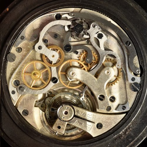 The 1936 catalog shows the Semikrograph as a stopwatch with 1/50 second accuracy and 3 minute capacity, but with no split second function. It appears that the Semikrograph with split second function (shown in this Gallery) is the earlier use of the model name. The Semicrosplit shown in this 1936 catalog has the same markings and functions as the stopwatch previously called the Semikrograph. We can assume that Heuer changed the name to Semicrosplit to make clear that this is a split second stopwatch.