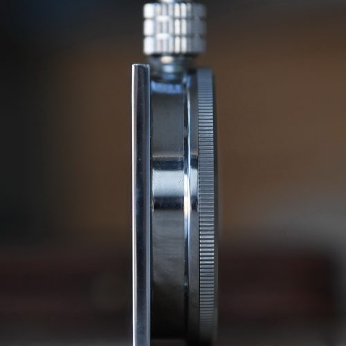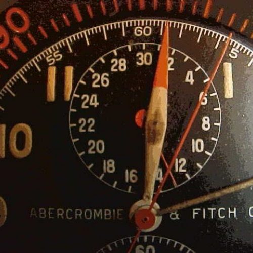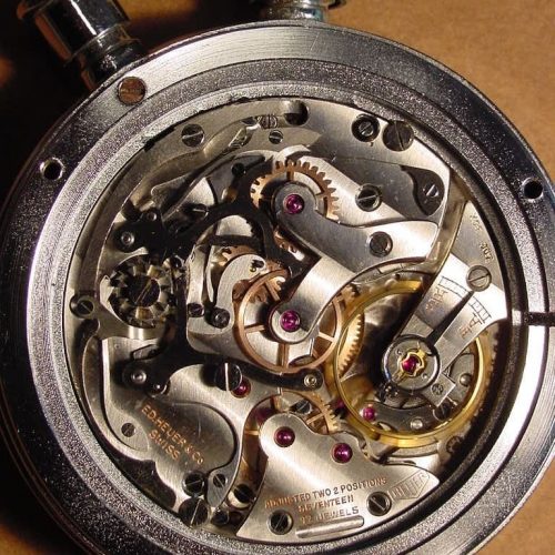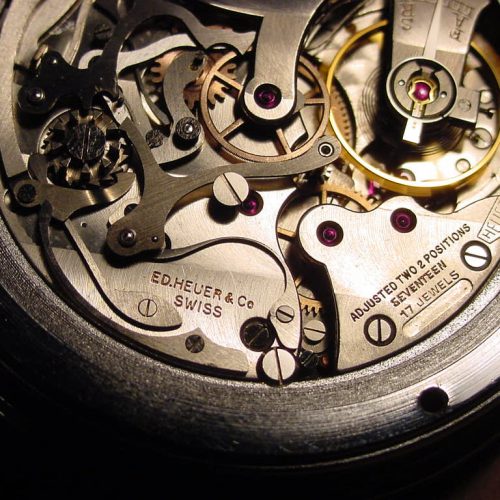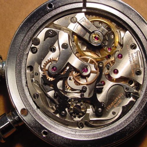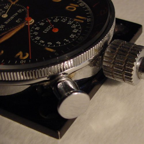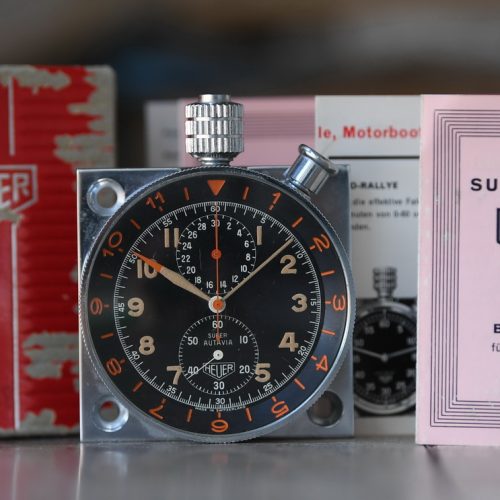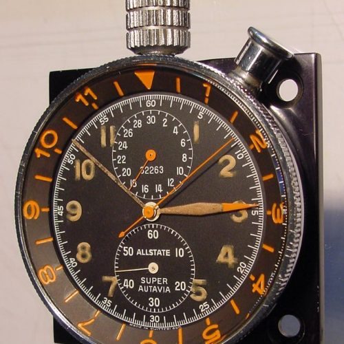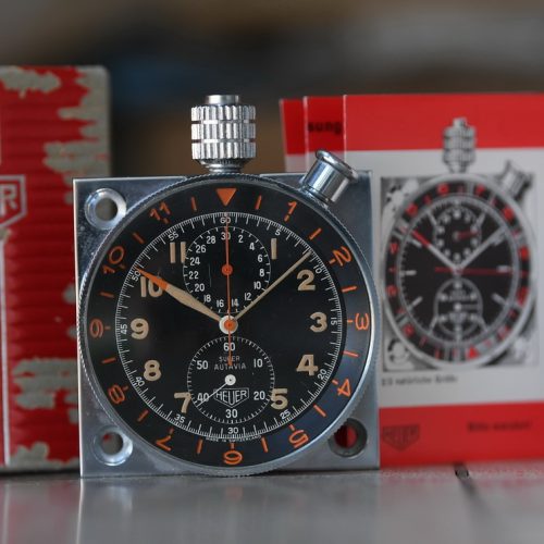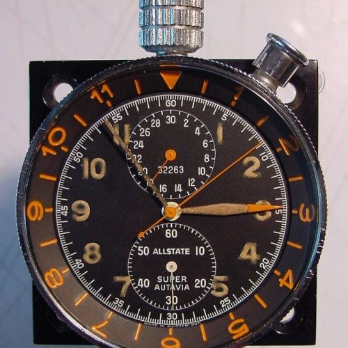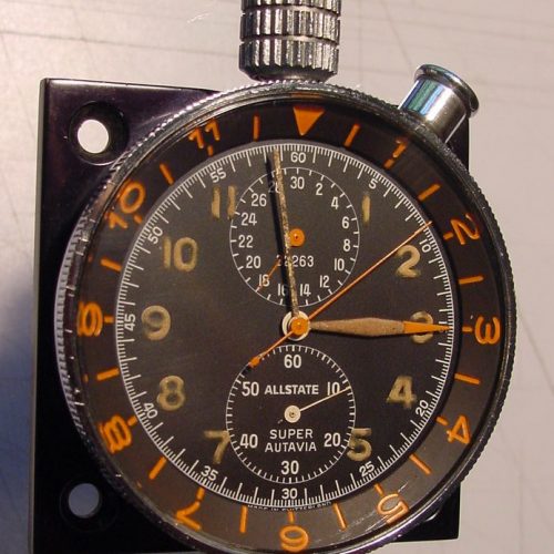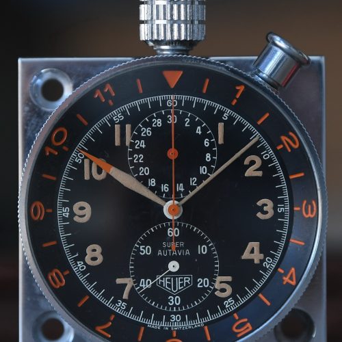 The “Transitional” version of the Super Autavia dashboard timer uses the first execution case, with the second execution dial (which has numerals, rather than only baton markers) and hands.