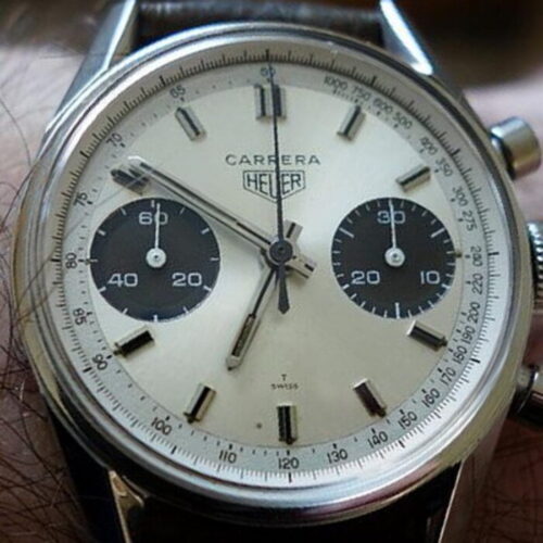 Carrera 30 chronographs are manual-wind, two register chronographs, with 30 minute capacity; they have second execution dials (wider, faceted applied steel or gold markers) and second execution hands (wider, polished steel or gold hands, with black and luminous inserts)