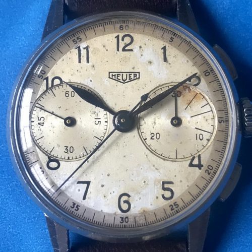 Reference 2433 is a manual-wind, two register chronograph (30 minute capacity), in a stainless steel case; described in the 1943 catalog as an "extra flat" model; Landeron 13 movement