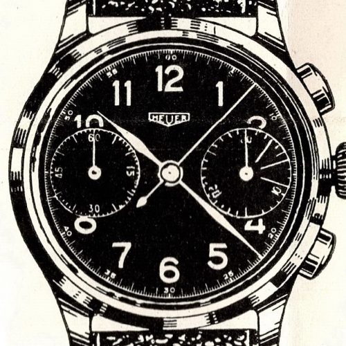 Reference 347 is a manual-wind, two-register chronograph (30 minute capacity); 36 millimeter, stainless steel snap-back case has oval pushers and rounded lugs; Valjoux 22 movement (14 ligne).