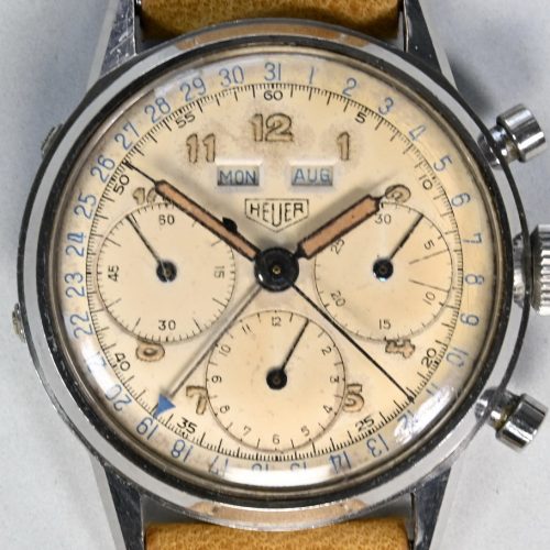 Manual-wind; three-register chronograph (12 hour capacity); with calendar for day, date and month; produced from the 1940s through 1960s